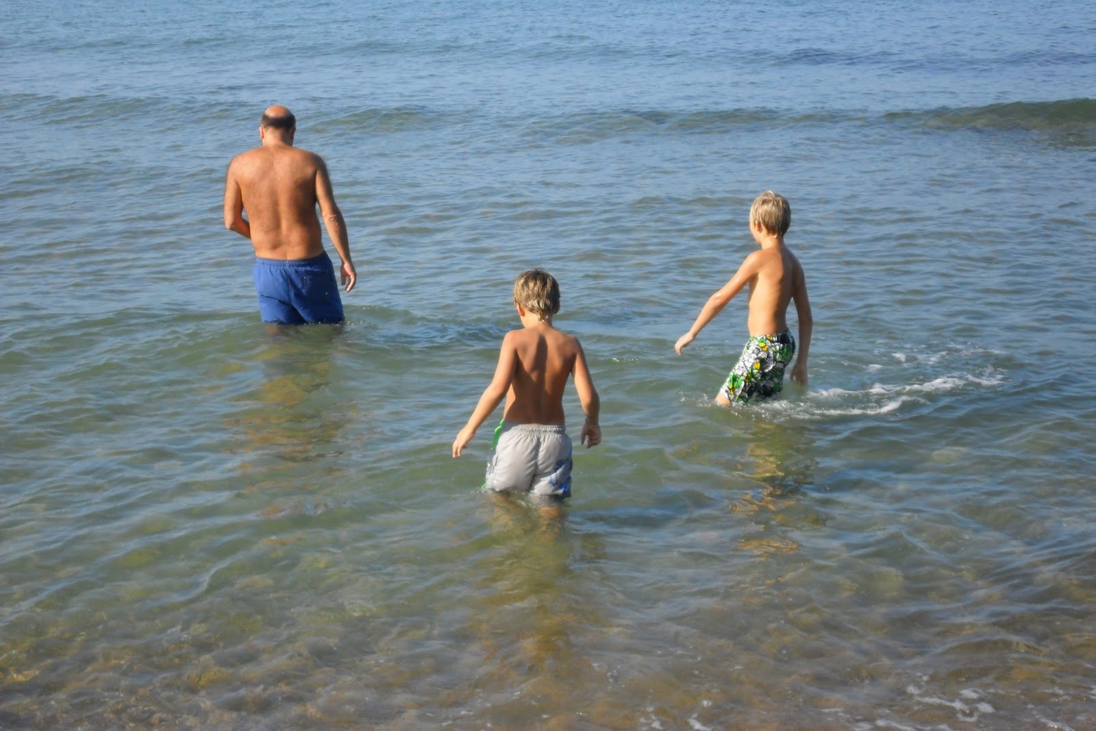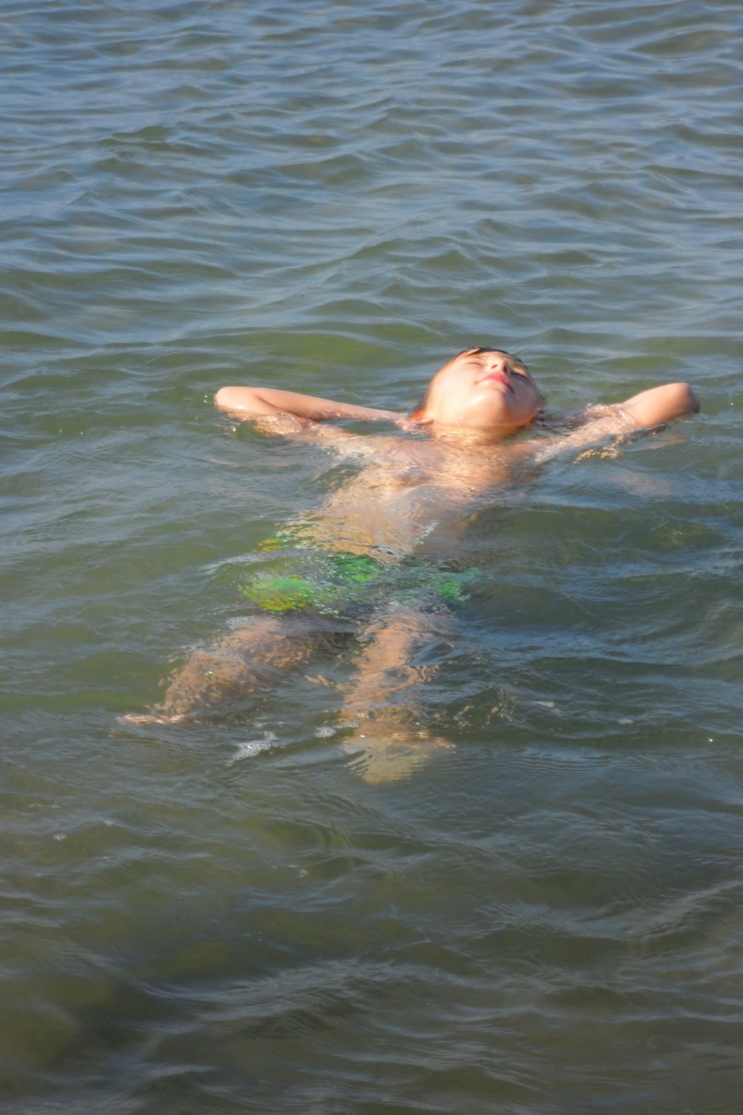| Mannen ber barnen att inte stänka på mig när jag långsamt försöker övertyga min kropp. De tar det på fullaste allvar och väntar lugnt in sin frusna mamma…Jag får veta sen, när jag äntligen tagit några simtag, att det var 23 grader i vattnet. |