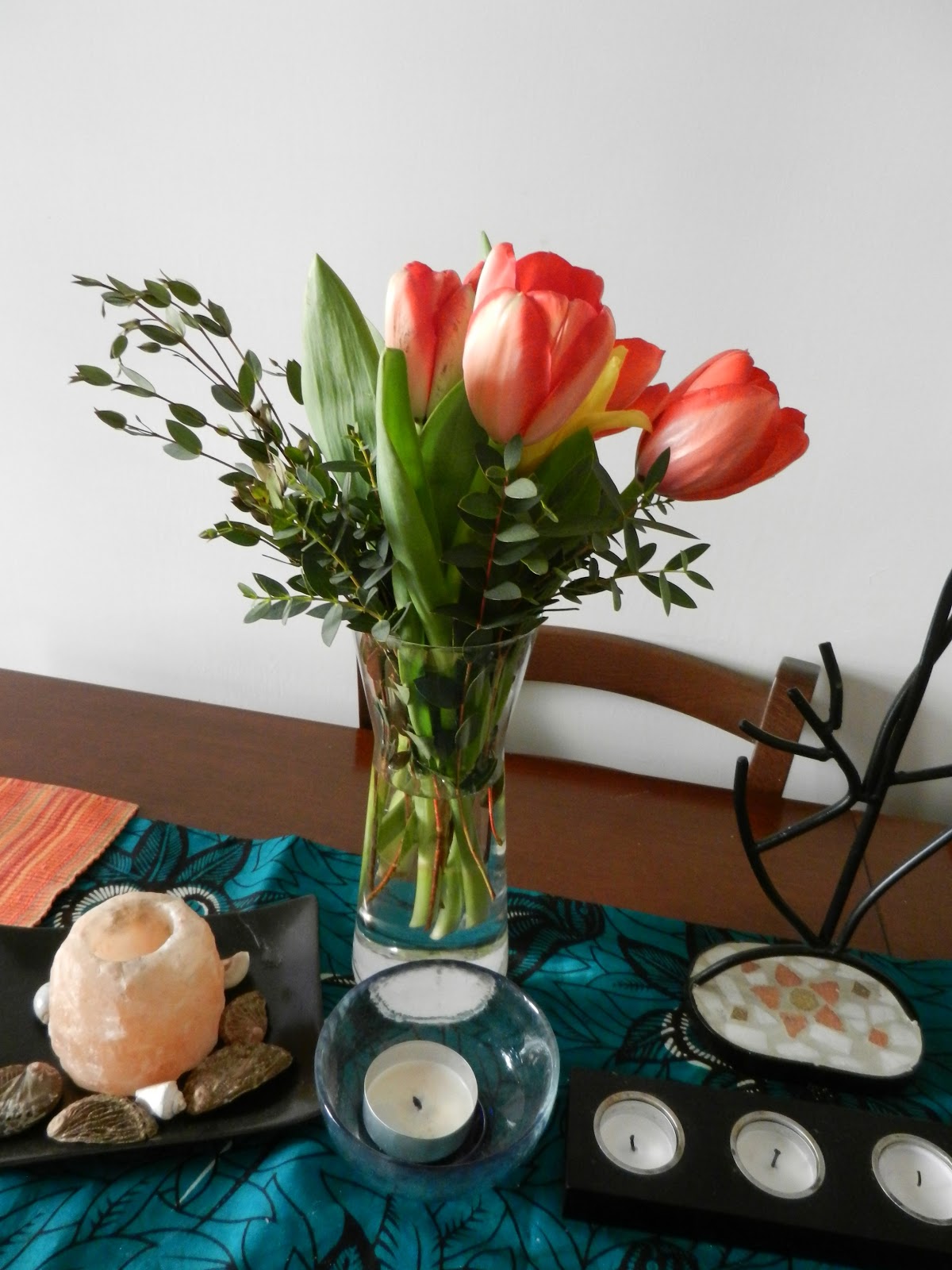 Men det finns ett slut på allt. Jag har lovat stora sonen att gå en sväng om hans skolan och köpa ett påskägg till förmån för cancerfonden. En flicka på skolan dog för ett tag sedan. Hur skulle jag kunna säga nej till detta. Efter skol-omvägen köper jag ett fång tulpaner också då jag passerar en trevlig blom-försäljare.