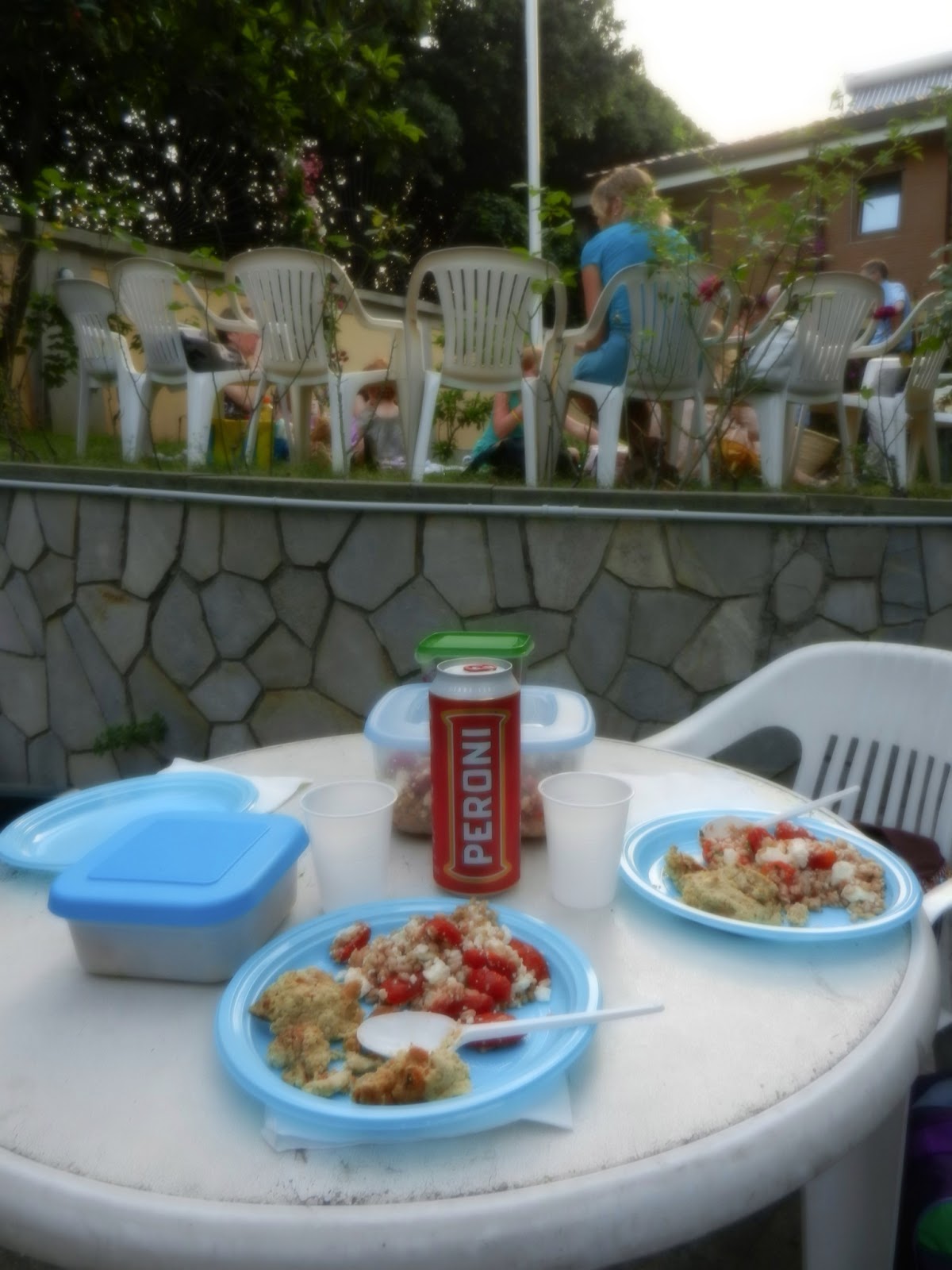 Äta medtagen dinkel sallad med ugnsbakade cocktailtomater och feta ost plus tofubullar. Dricka öl och äta jordgubbar med mannen medan solen går ner och sonen får sin varma korv med bröd.