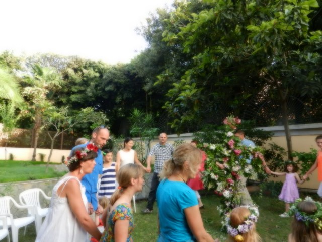 i Rom med hemmagjord krans på ”köpeblommor”.