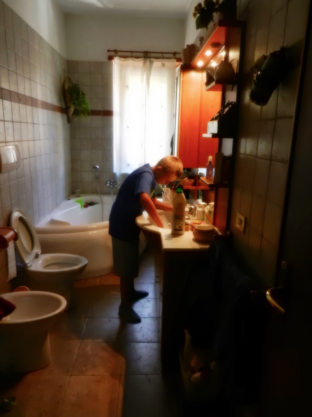Stora pojken torkar av handfat, spegel och duschkabin…möjligen blir det inte världens mest djupgående rengöring. Det struntar jag högaktningsfullt i. Jag får ju mera tid att tänka på. Som inte avbryts av att jag måste gå emellan två rytande lejonhanar.