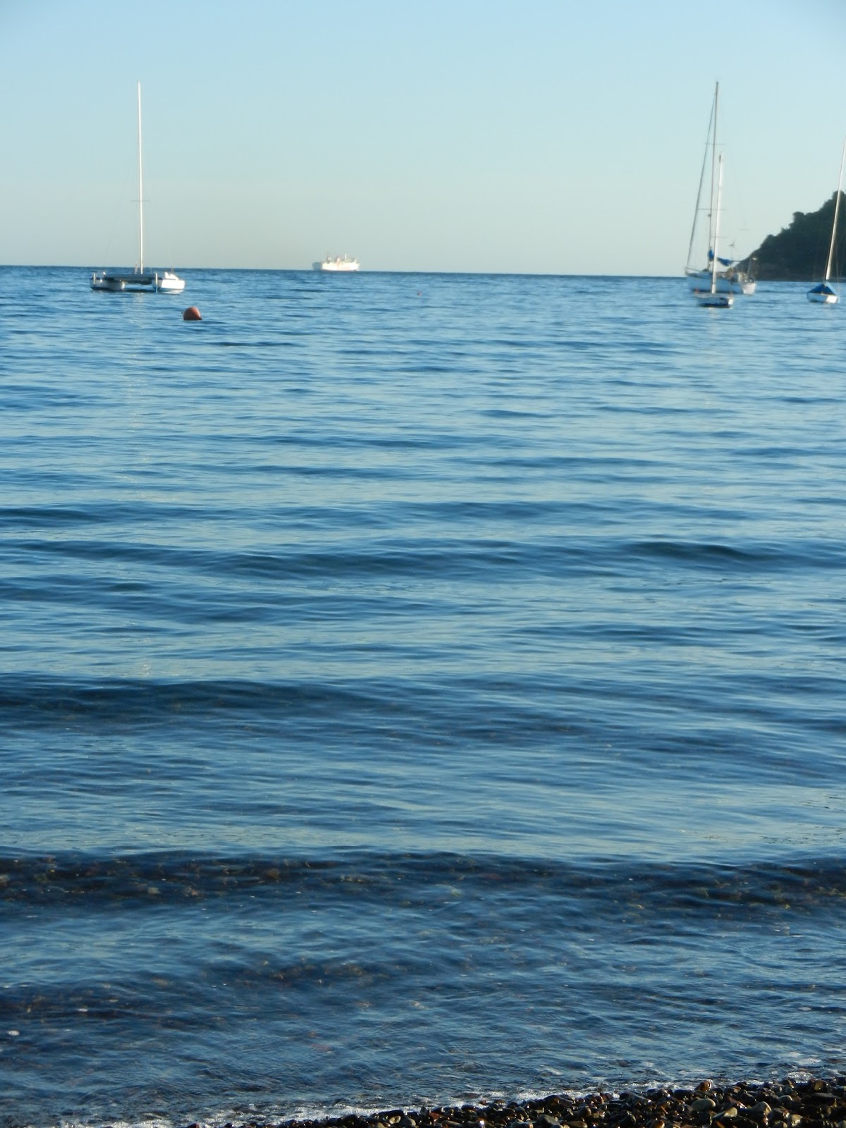 Färjorna som avlöser varandra mellan Portoferraio och Piombino. Någon dundrar mer än någon annan. Ljuden blir så tydliga. Jag kan höra när de ber passagerarna gå ner till sina bilar för att de snart ska lägga till i hamn.