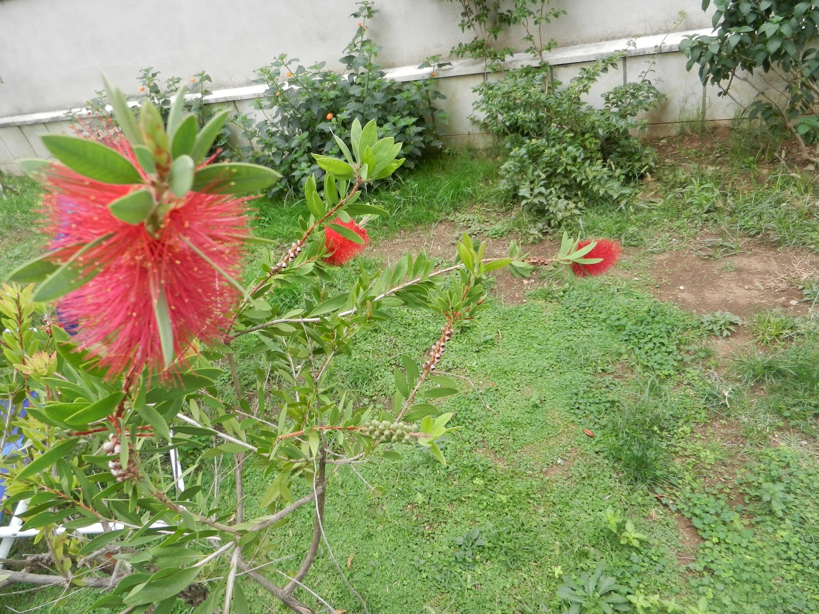 Callistemon som sett så sorgsen ut sprutar fullständigt sina röda tofsar.