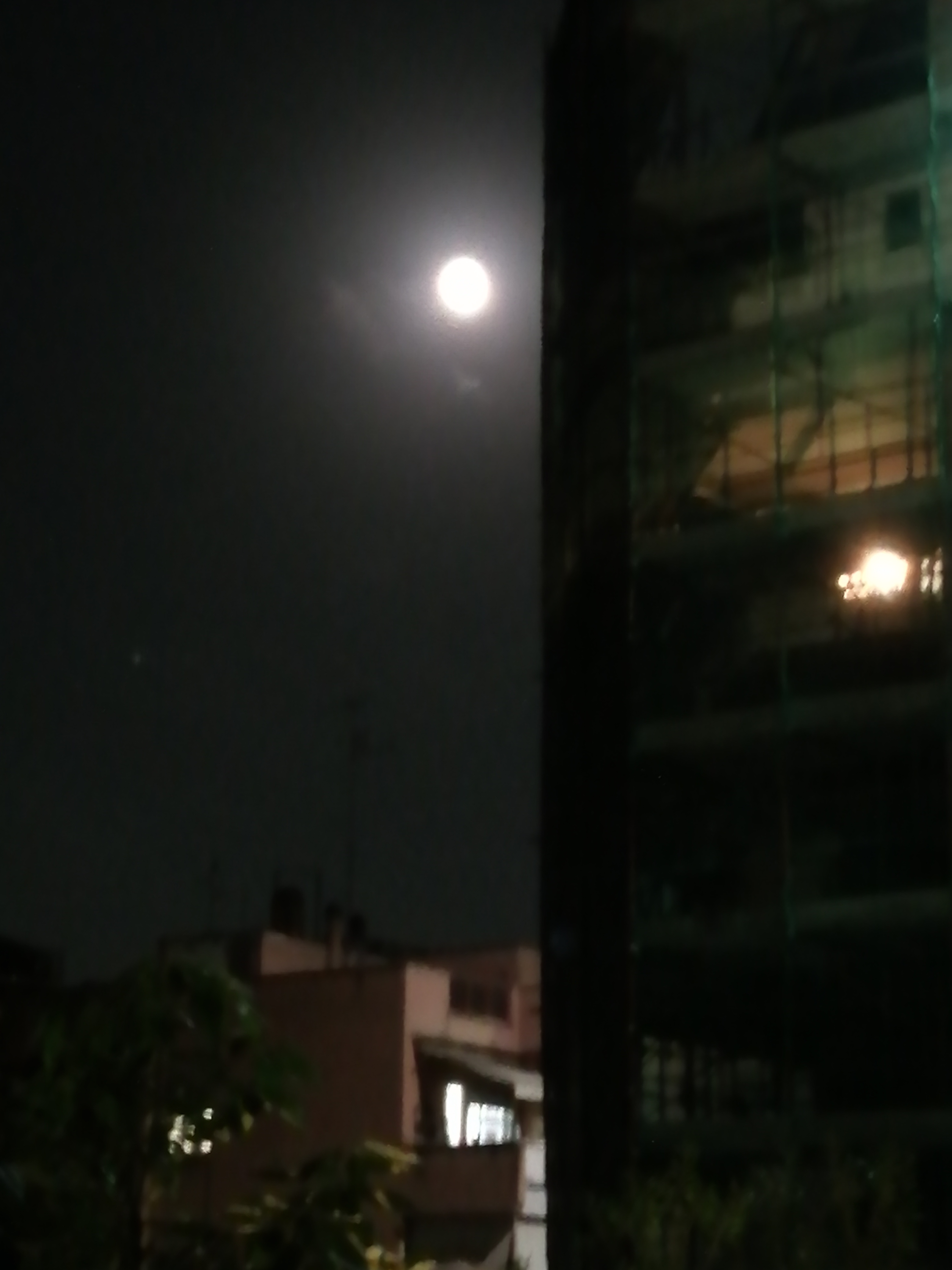 Men när jag går ut för att plocka in tvätten så ser jag äntligen fullmånen mellan husen. Det gick ju inte igår då just de tunga grå molnen trängdes på himlen och skymde.