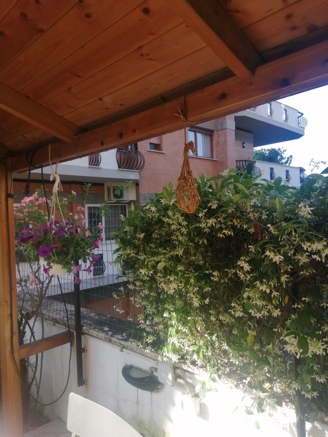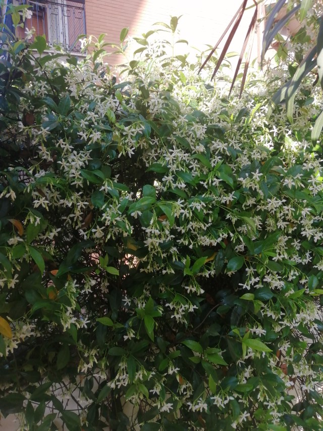 Sen är det den där muren av stjärnjasminen som nu blommar och doftar för fullt.