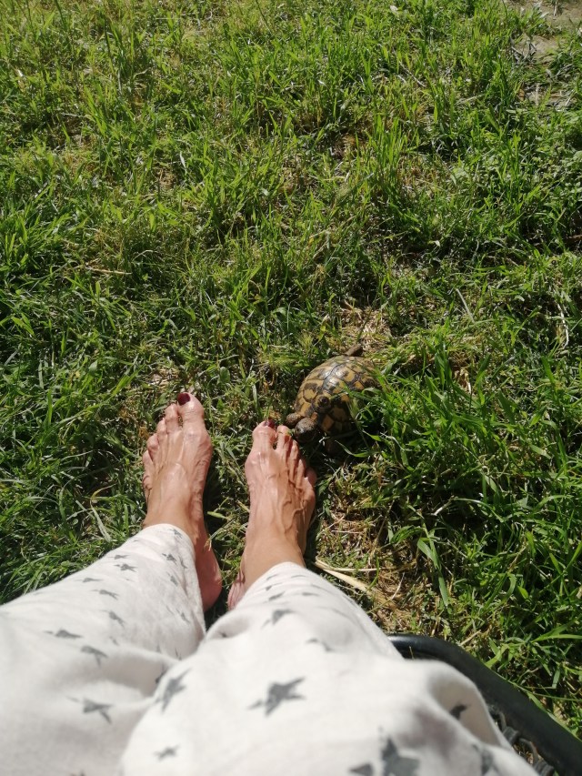 Då ser jag sköldpaddorna. De som jag ju inte vet vad jag ska göra med om jag händelsevis skulle stanna i Sverige, utan att något annat stoppar det igen. Här kan jag inte låta bli att tänka att den jäveln jag bott med i trettio år var den förste att förstöra mina planer. Så då går jag snabbt tillbaka till mina sköldpaddor. Inte fastna i det gamla.