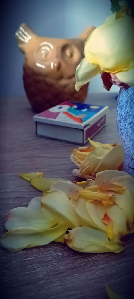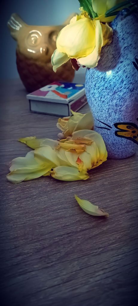 En av de två rosorna jag tog in, från trädgården, har tappat bladen.