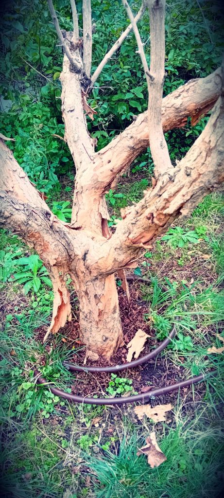 Så fort han ser bilden säger han att trädet har problem med för mycket vatten som står kvar vid rötterna. Jag får tipset att sticka ner ett 30/ 40 cm’s järnspett runt trädet för att göra små dräneringshål. En hjälp på traven. Sen, när jag kollar vad jag har för produkter hemma, ska jag ta bild på dem och komma tillbaka. Det finns någon form av medicin som man kan ge så klart. Kanske har jag den redan.