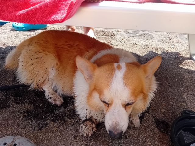 Vi får våra solsängar under parasollet, i andra raden (första raden närmast vattnet är helt fullbokad), och hunden gräver snabbt ner sig i sanden under sonens säng. Han vill åt den där våta sanden. Magen ska liksom ligga i den.