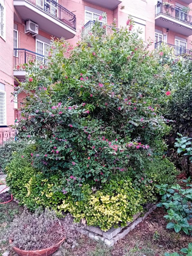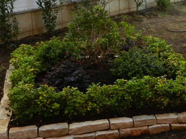 Han som hjälpte oss med projektet på plantskolan tyckte inte att vi skulle slösa detta fina ställe med grönsaksodling utan övertygade oss om att flytta på flaskborstträdet (Calistemon). Sätta det i mitten och sedan bygga upp med grönt runt om. Med en fin liten stenmur omkring.
