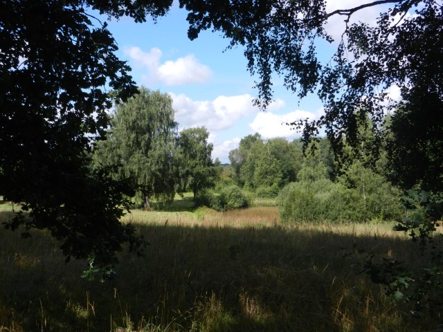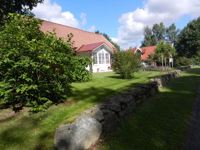 Då visar min faster mig en damm de byggt bakom huset. Långt där nere ligger den. Fast ändå på deras tomt.