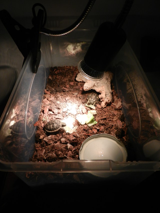 I väntan på att de som tingat sköldpaddsbebisarna ska hämta dem har de fått ett nytt litet hem med värme och allt.