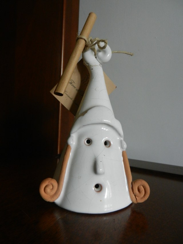 När jag ändå är igång får jag tag i en keramikprydnassak jag fått av en pojke jag jobbade med för några år sedan. Han var en svår typ. Jag fick presenten för att jag förstod honom skrev hans mamma. Prydnadssaken kommer från Neapel och jag är såklart fäst vid den så när en viss svansföring här hemma slog ner den så att toppen gick av lät jag den stå tills lagningsandan skulle falla på. Man får liksom lägga sig på vågen och flyta med när den är rätt.