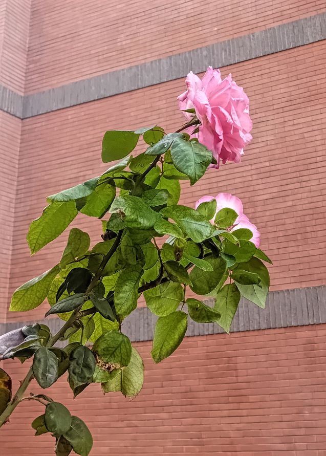 De rosa rosorna blommar också.
