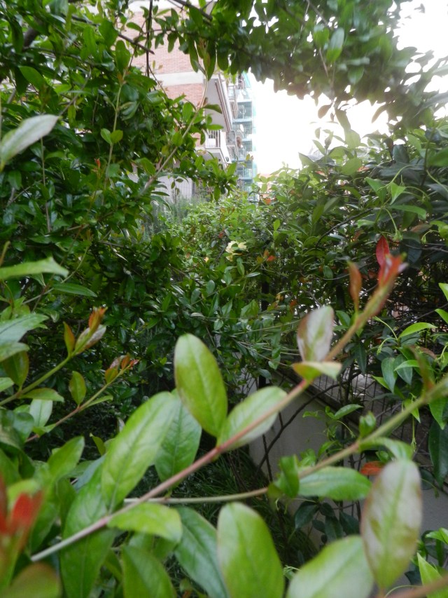 Granatäppelträdet som jag ju klippte ner har växt över förväntan och bildat en egen grotta. Man kommer knappt in till de gula rosorna och rosmarinen i hörnet.