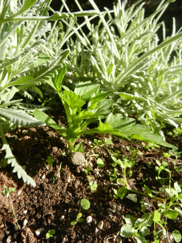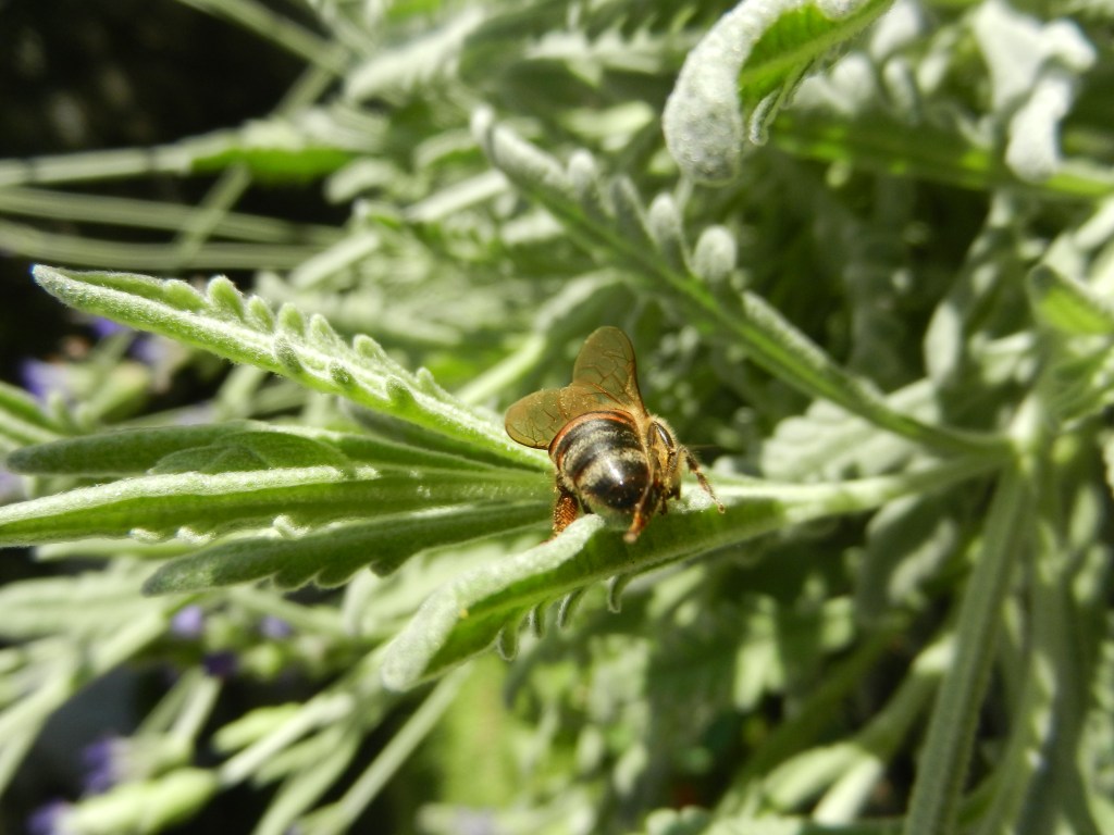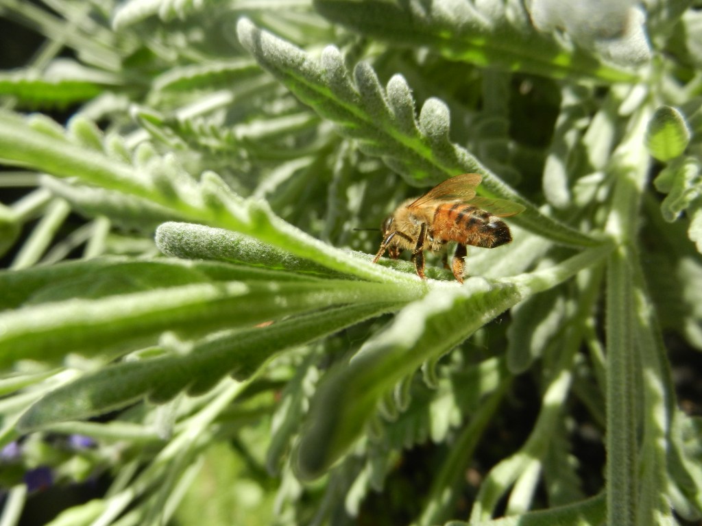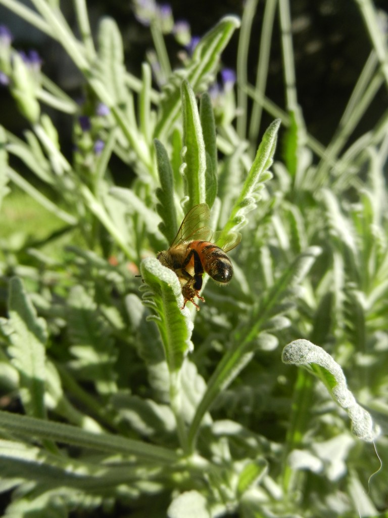 Sätter mig ner på marken med kameran laddad. Älskar mina lavendlar. De doftar redan gott och en och annan insekt surrar runt dem.