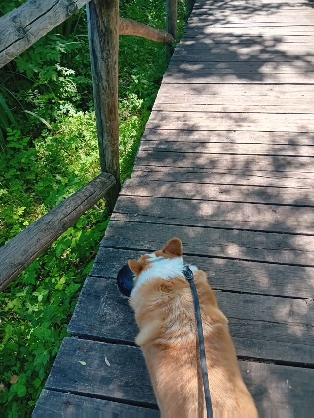 Vi går bron fram tills vi kommer upp till en lekpark. Där stannar vi en liten stund för vattenpaus. Min hund har tungan på marken. Jag berömmer honom för han har klarat av hundmöten utan att morra på den trånga bron. Imponerande. Eller så är han i chock…