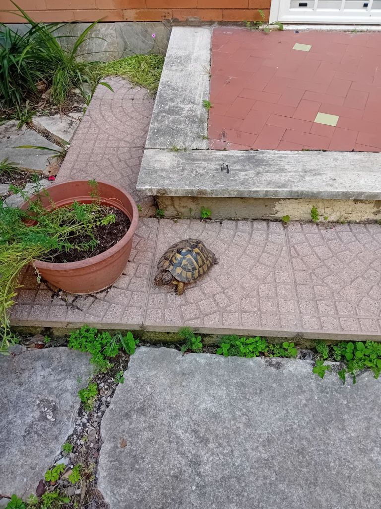 En dag när jag sitter i min solstol kommer det en liten sköldpadda krypande. Först blir jag eld och lågor. Tror på mirakel. Att det är den där som jag släppte ut för något år sedan och som sen försvann. Sansar mig snabbt och inser omöjligheten i detta. Den skulle ju vara betydligt större än så här.