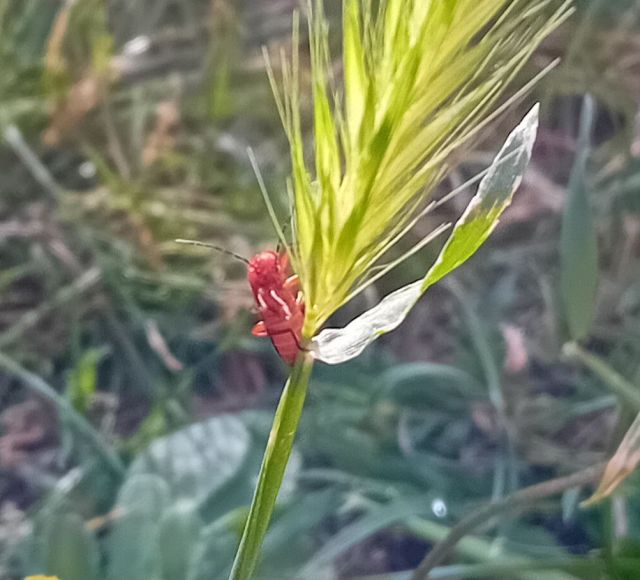 Då ser jag en röd liten lång insekt med svarta vingspetsar sitta på just ett av dessa ogräs..