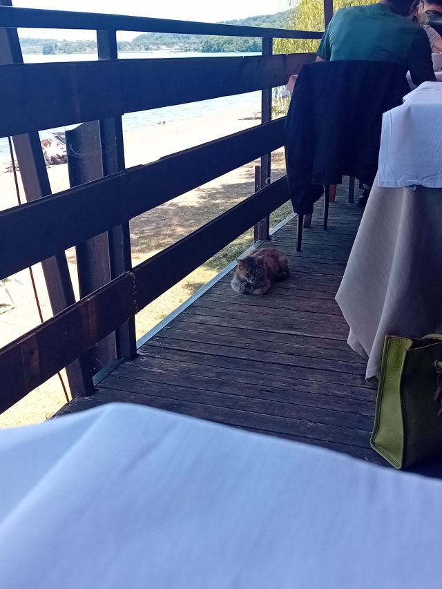 En utav de tre/fyra restaurangkatterna verkar ha upptäckt vargen under bordet för den håller sig på lagom avstånd.
