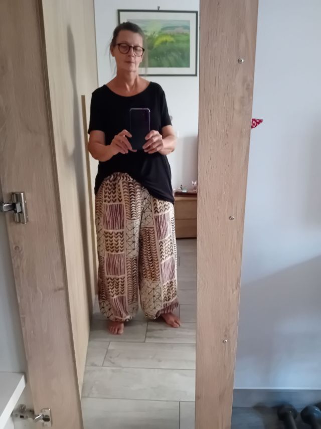 När jag ändå var igång, och tyget är mycket i ett dubbelt påslakan, blev det ett par byxor också. Medan jag ritade av mönstret till en favoritklänning så hade jag redan ett välprovat mönster till byxor. Jag köpte det en gång för många år sedan och det är enkelt och kul att använda.