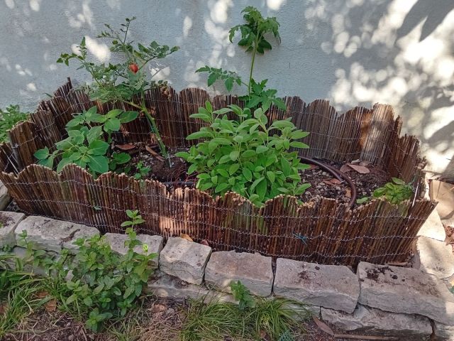 Jag byggde också in mina tomater och kryddväxter med ett litet staket jag hittade på plantskolan. Så kunde stenarna flytta tillbaka på sina platser.