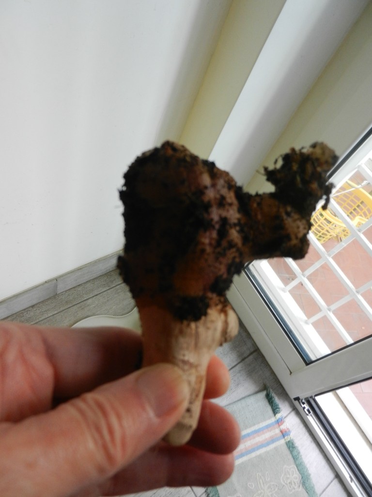 När jag går förbi krukorna vid trappan slår jag en blick ner i dem och funderar på var jag satte ingefäran. Så ser jag den sticka upp ur den stora krukan. Jag gräver upp den och blir jublande glad.