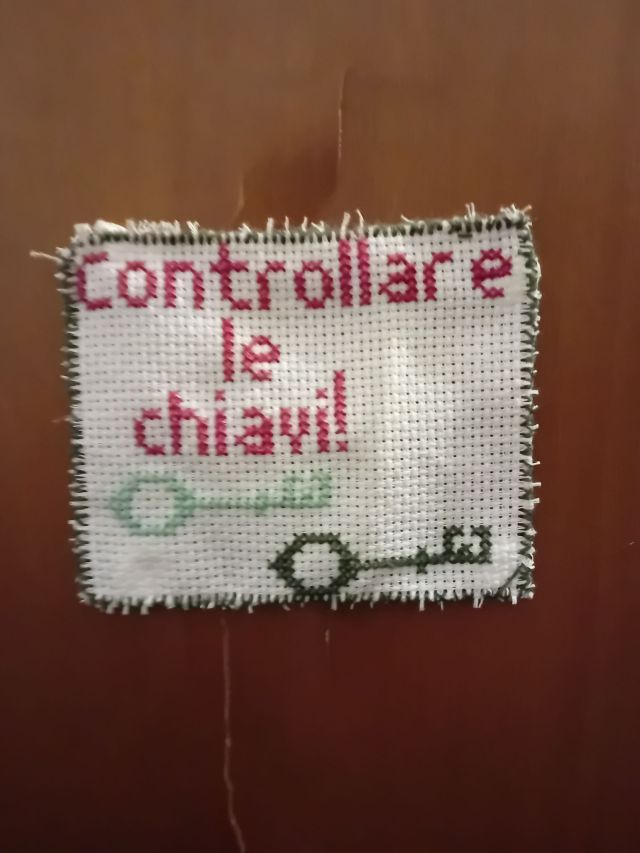 Jag tänker också att nästa gång ska jag inte bara kolla som jag brukar att nycklarna ligger i fickan innan jag stänger igen dörren utan även blicka upp på dörren där jag själv satt upp en liten lapp som jag själv broderat, då detta var en sak som hände oss (här skriver jag oss för det är inte bara jag som är disträ här hemma) ofta.