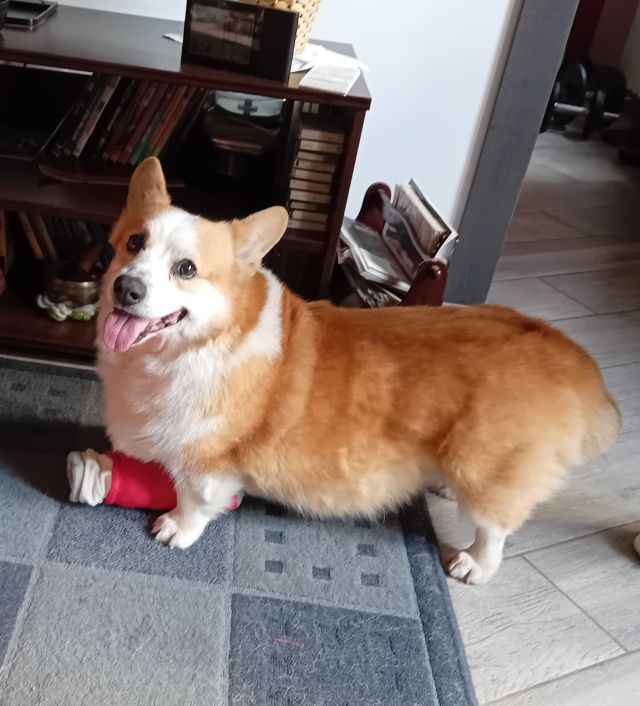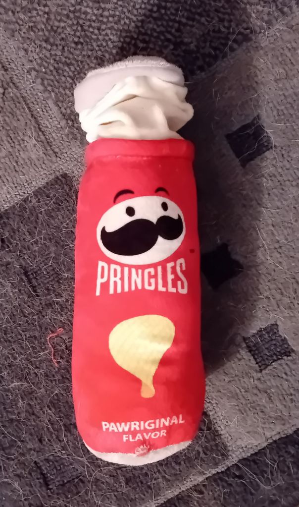 Jo, ett stort tuggben, viltgodis och en pipleksak i form av en pringlesburk.