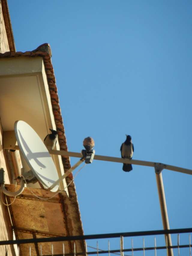 Den sitter märkligt stilla. Jag tror nästan att jag inbillar mig när en annan kråka kommer till den första kråkans undsättning och den där klumpen jag tror vara en falk flaxar till.