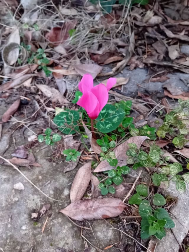 Under en av dessa små utflykter hittar jag en cyklamen som självsått sig mellan gångstenarna.
