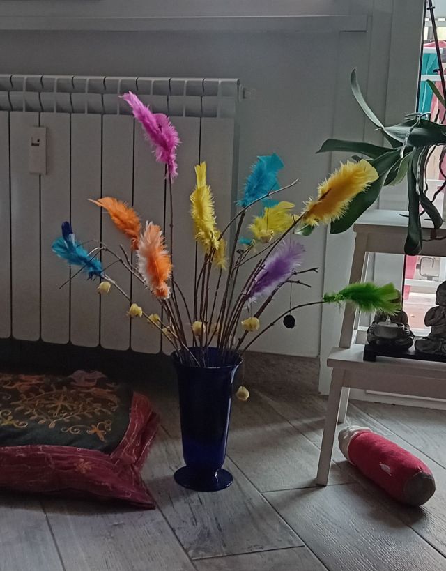 Jag klippte ju och körde till tippen men en hel del är kvar än. Så till hundens stora förvåning (han hoppades på något helt annat) gick jag sen där ute och plockade och fick ihop en litet påskris jag kunde sätta mina återanvända fjädrar och hänga lite kycklingar i.