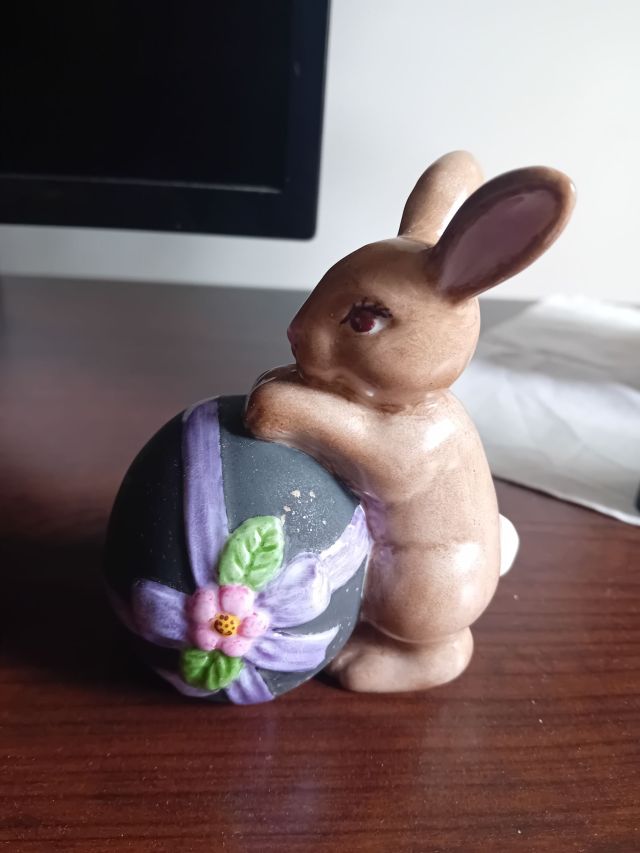 Den lilla kaninen som mor målade till en av sönerna och som jag räddat i stormens tid (den andra gick inte att återuppliva, för hon gjorde såklart två) har redan stått ett tag på tv-hyllan.